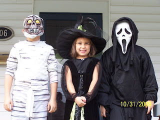 Well, it's been awhile since we've done any updating and many things have happened since the last post, but the most important have been Halloween and Birthdays. We now have a 12 year old, a 10 year old, and a 7 year old who were Scream, a witch, and a mummy for Halloween. Just a few pictures. They aren't very good quality so I do apologize.